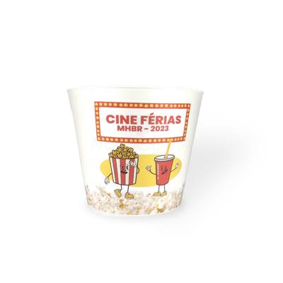 Balde de Pipoca Balde de pipoca personalizado com capacidade para 2,3L, reutilizável, 100% reciclável. Decoração in mold label 360º, sem limitação de cores. Até 2 modelos, cor interna única. Ideal para brindes corporativos, eventos promocionais, cinemas e festas. 17,0 cm x 14,0 cm