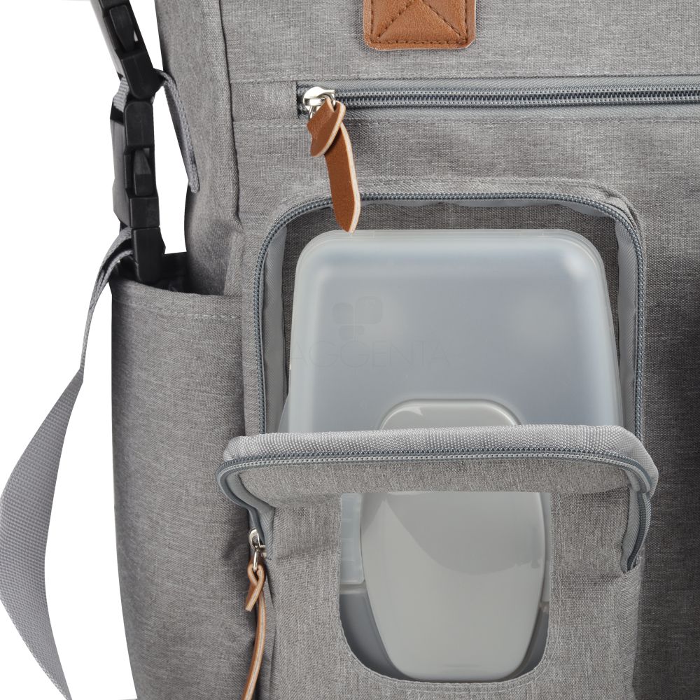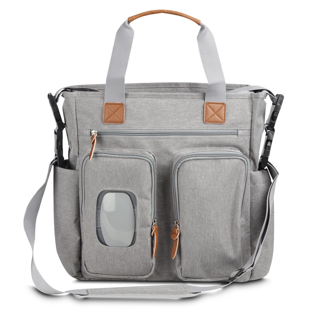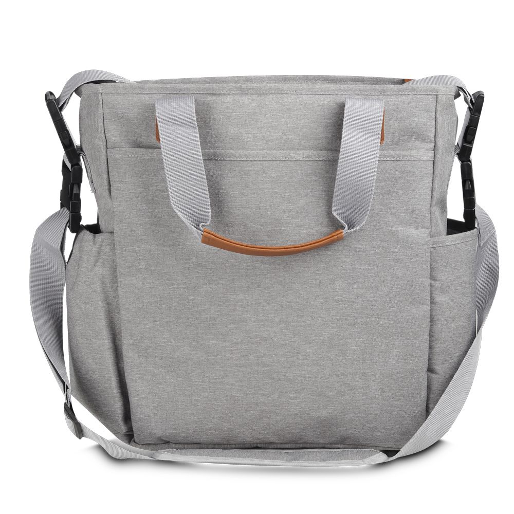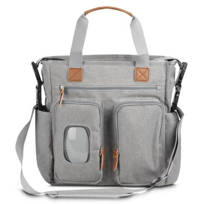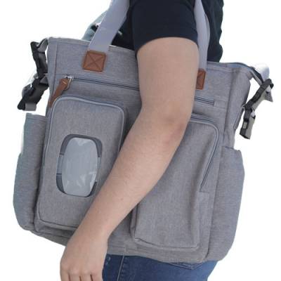 Bolsa funcional em poliéster e couro sintético, compartimento com divisórias, alça de ombro e mão, 4 bolsos laterais.