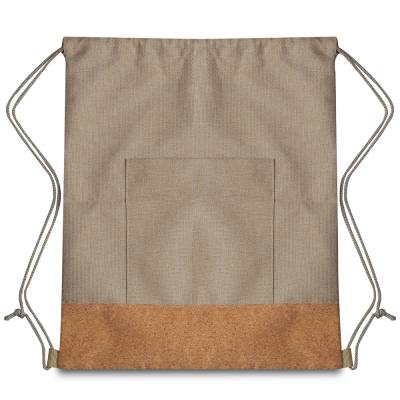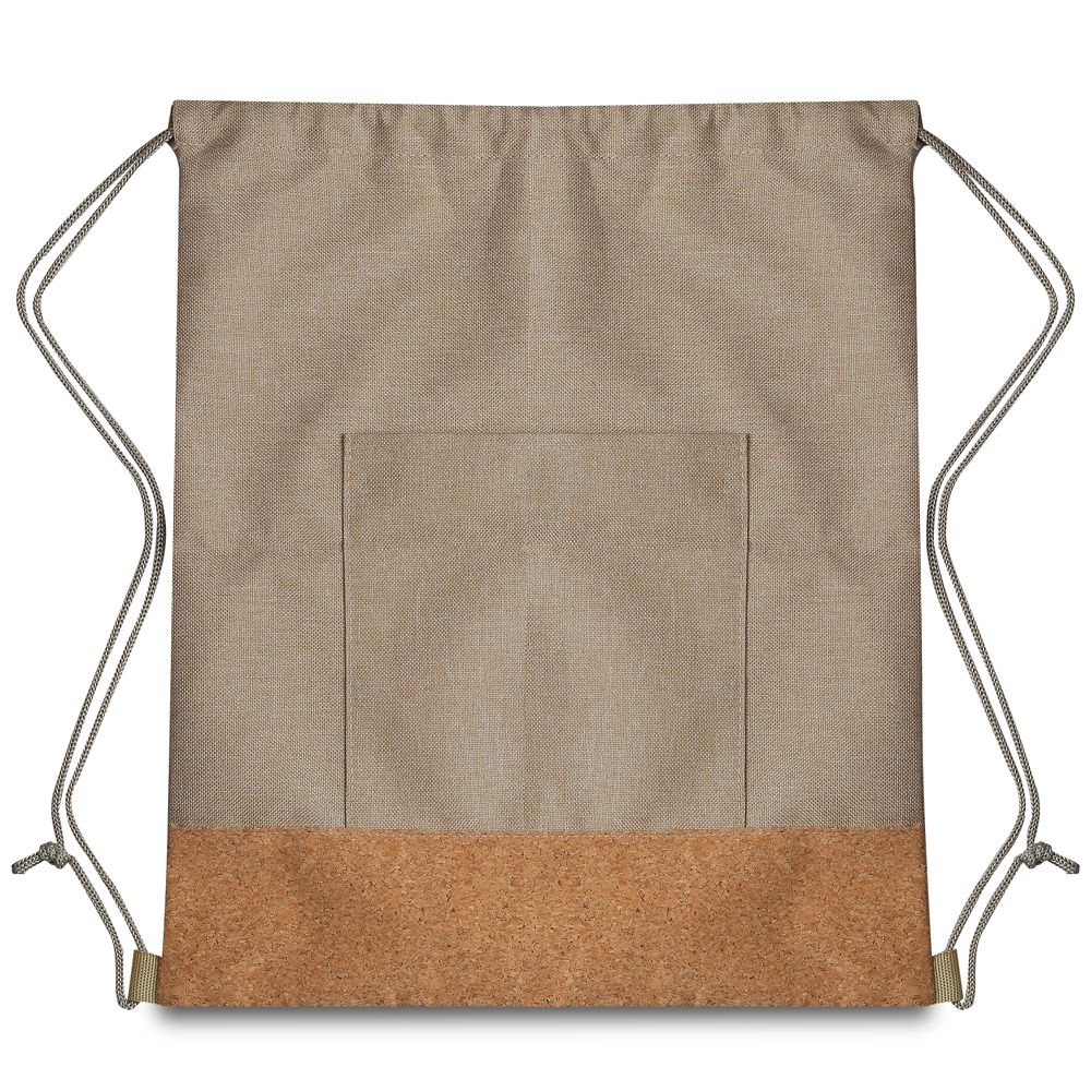 Sacola/Mochila em poliéster 600D com detalhe em cortiça, alça dupla para colocar nas costas e bolso frontal.
