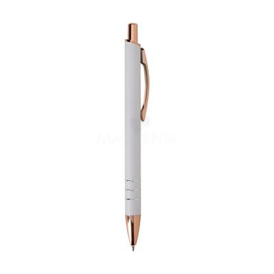 Caneta metálica com acionamento por clique e carga esferográfica azul de 1.0mm, uma combinação que oferece pegada leve para uma escrita mais precisa.