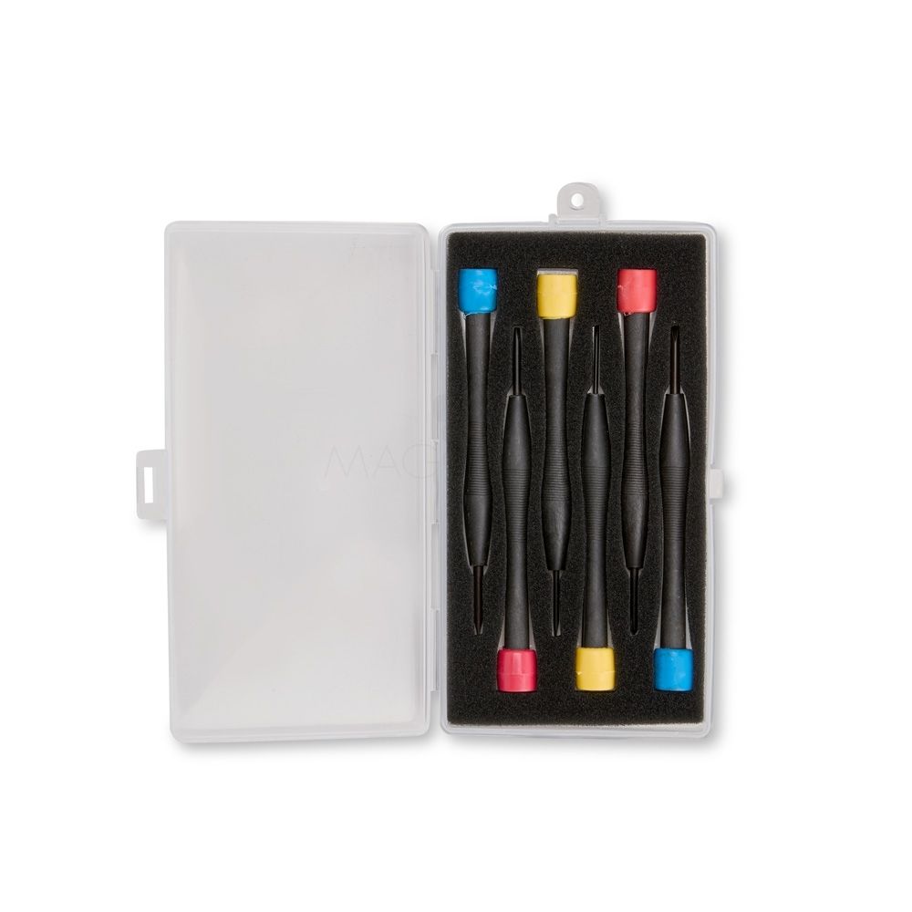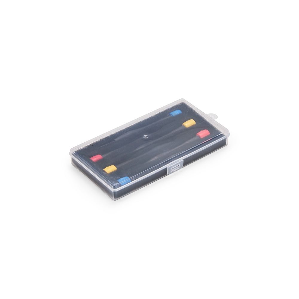 Linha Masculina Kit de ferramentas com seis chaves com cabo plástico e pontas metálicas. Contém quatro chaves de fenda e duas chaves Phillips com pontas em tamanhos diferentes. Acompanha estojo plástico com espuma removível para acomodar as peças. 8,0 cm x 16,0 cm x 1,8 cm 63 g