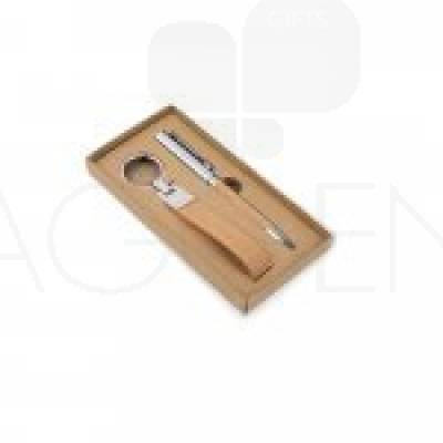 Kit Escritório Conjunto composto por uma esferográfica e um chaveiro, ambos em metal e cortiça. A esferográfica tem clipe em metal, mecanismo twist e escrita em azul. Fornecido em caixa presente de papel kraft reciclado.q 7,0 cm x 16,0 cm x 1,7 cm 95 g