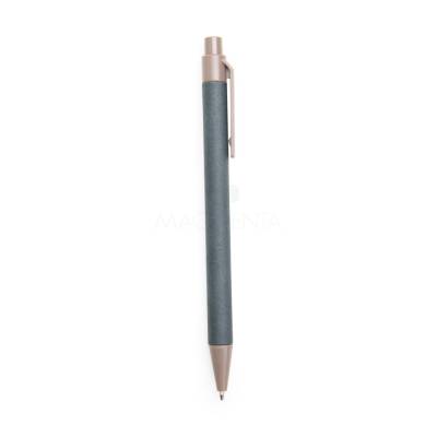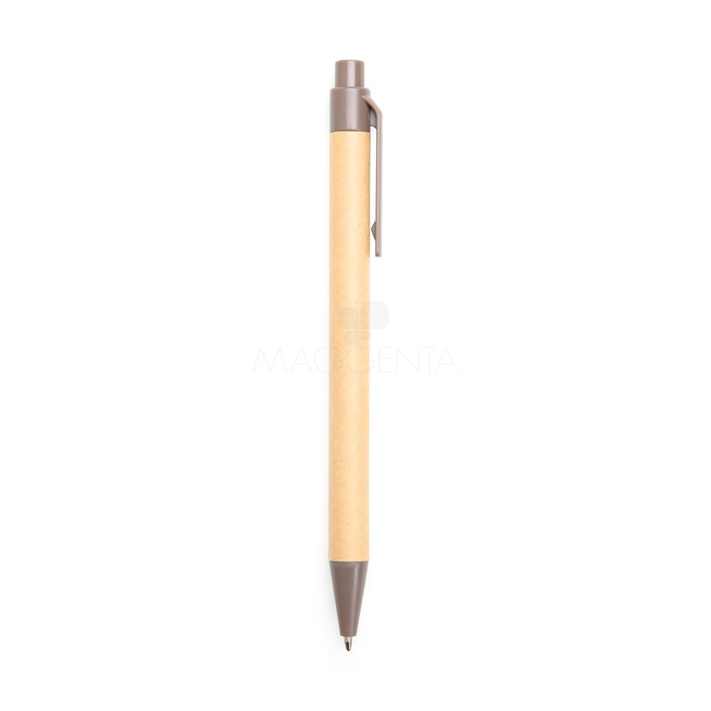 Caneta com corpo em papelão, ponteira e clip em plástico ABS, com acionamento por clique e carga esferográfica azul de 1,0mm.
