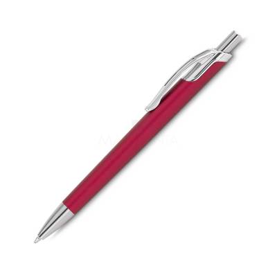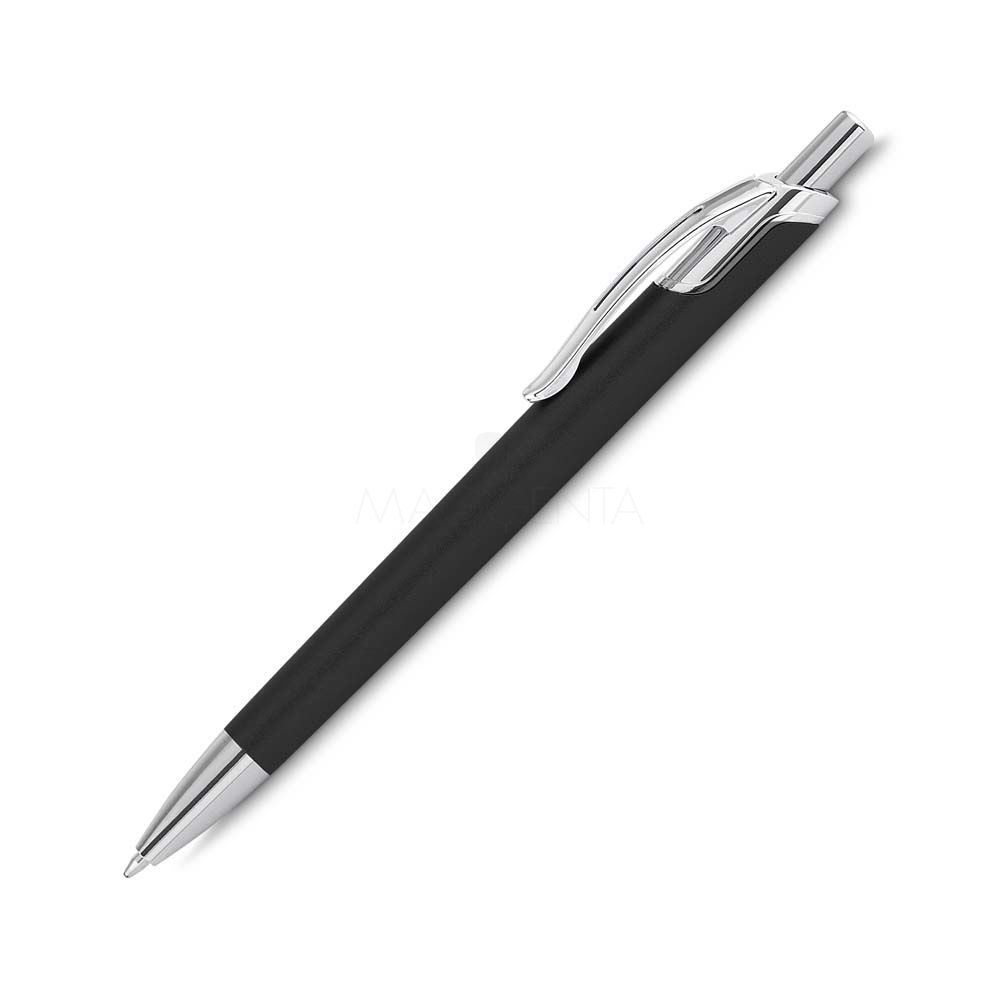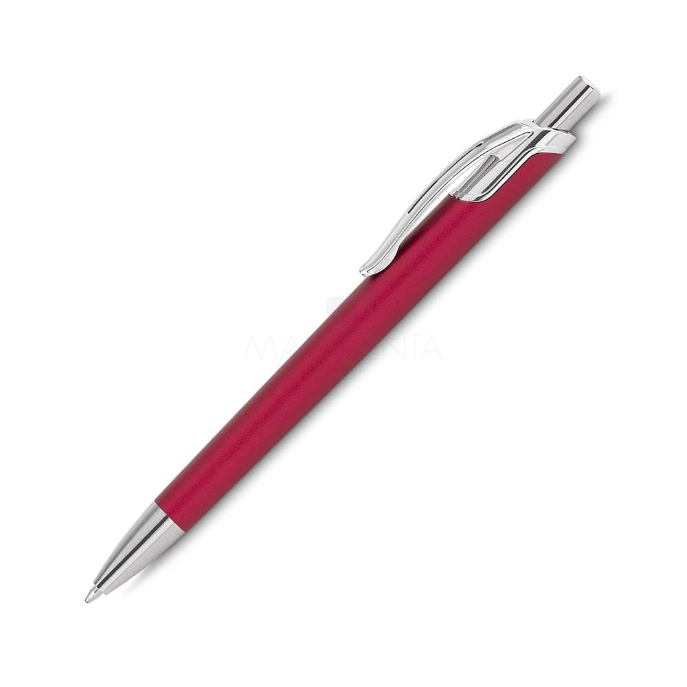 Caneta com corpo em alumínio reciclado, acionador e clipe cromado, escrita esferográfica em azul.