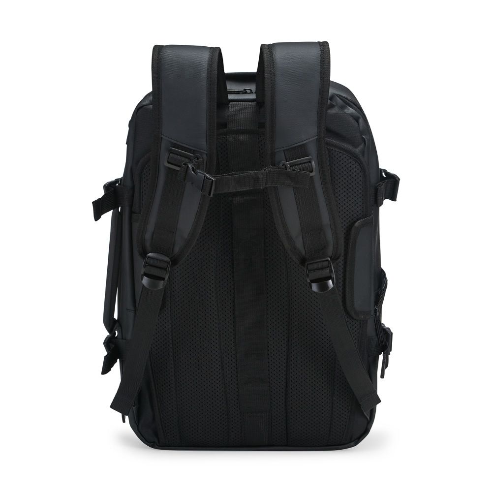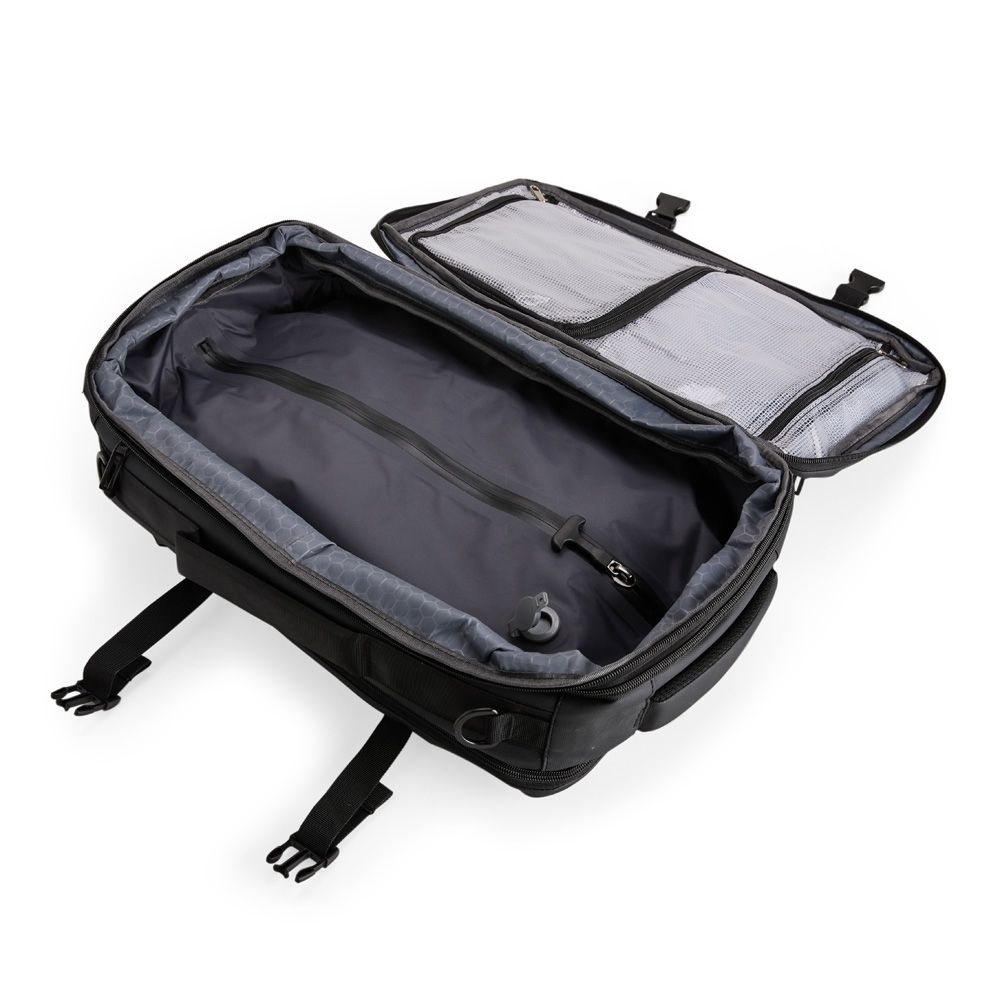Mochilas Mochila em nylon com uma camada de PU impermeável com capacidade máxima de 28 litros. Possui um compartimento interno a com sistema de vedação vácuo para guardar roupas e outros objetos (bomba compressora não incluído) e duas divisórias em poliuretano termoplástico de tamanhos diferentes, além de bolsos frontais, um lateral em tela e outro traseiro com divisória para notebook de até 15,6 polegadas. Dispõe ainda de alças acolchoadas em espuma respirável, uma alça lateral para transporte horizontal e outra para ombro ajustável em nylon. 29,0 cm x 44,0 cm x 16,0 cm 1322 g
