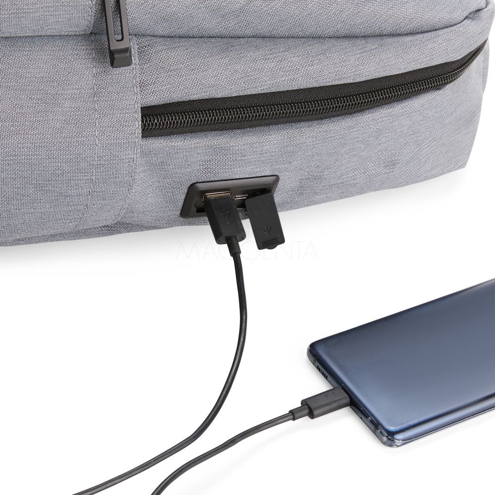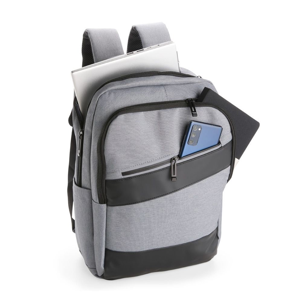 Mochilas Mochila confeccionada em Oxford Jacquard impermeável com detalhes em couro sintético e capacidade de até 15,6 litros. Possui compartimento principal com bolsos em diferentes tamanhos e uma divisória para notebooks de até 15,3 polegadas. Conta com entrada externa para cabos USB-A e USB-C, dois compartimentos frontais com zíper e dois bolsos laterais abertos. Dispõe ainda de alça superior, duas alças de costas e painel traseiro acolchoados, além de engate em nylon para malas de viagem. 26,0 cm x 38,0 cm x 13,0 cm 808 g