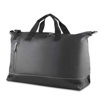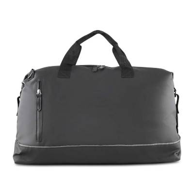 Mala esportiva em PU com revestimento interno em poliéster 210D. Possui faixa refletiva, bolso frontal com zíper, alça de mão e alça de ombro ajustável, além de dois compartimentos internos.