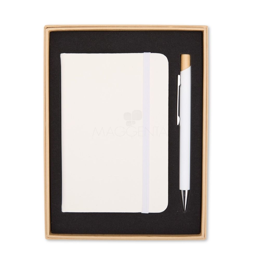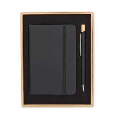 Kit Escritório Kit executivo composto por uma caderneta e uma caneta. A caderneta possui capa dura em couro sintético, marca-páginas em fita de cetim e elástico para fechamento, além de aproximadamente 80 folhas com pauta. Por sua vez, a caneta metálica conta com detalhe em bambu, acionamento por clique e carga esferográfica azul de 1,0mm. Acompanha uma caixa de papelão com berço interno em espuma. 14,5 cm x 19,0 cm x 2,2 cm 212 g