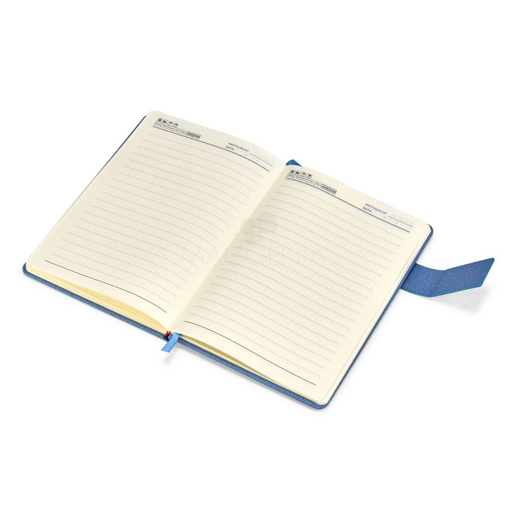 Caderneta capa dura em couro sintético com fecho magnético, placa metálica personalizável, além de marca-página em fita de cetim e aproximadamente 96 folhas brancas pautadas.