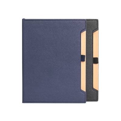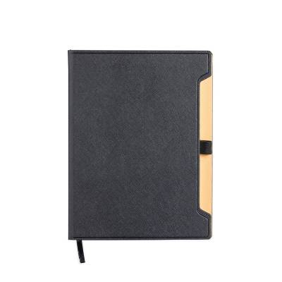 Caderneta com capa em couro sintético, suporte elástico para caneta, marca-páginas em fita de cetim e aproximadamente 96 folhas marfim pautadas.
