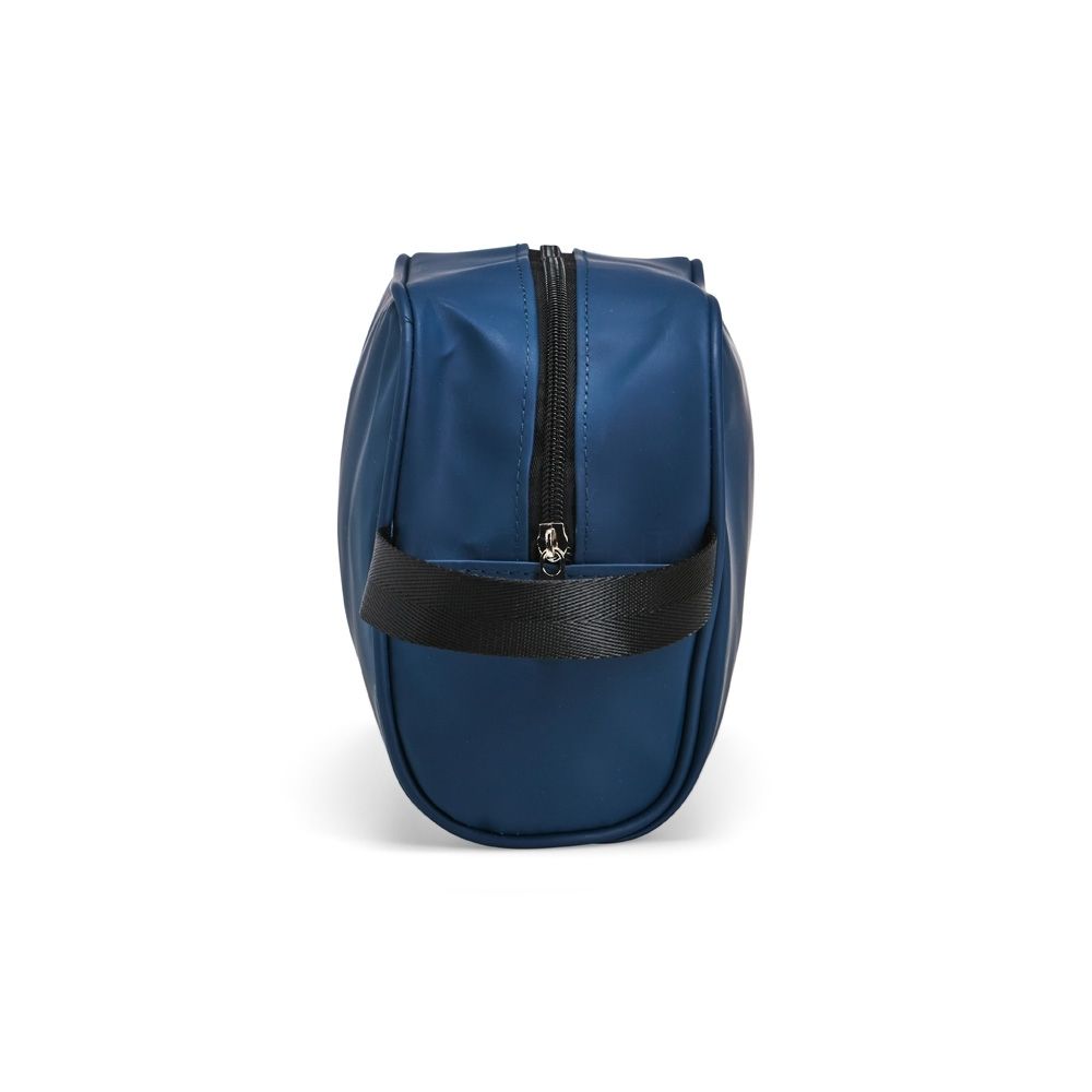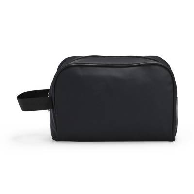 Nécessaire em couro sintético impermeável com fechamento em zíper e alça lateral confeccionada em nylon.