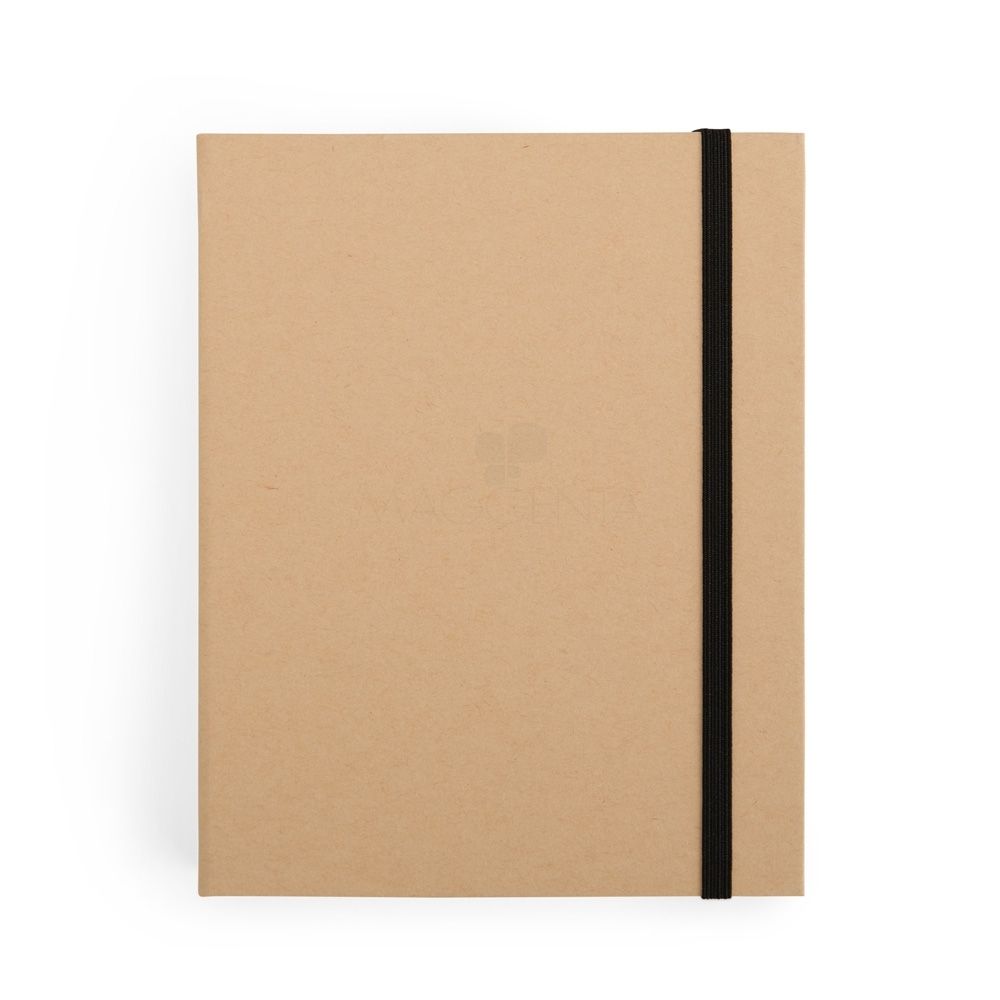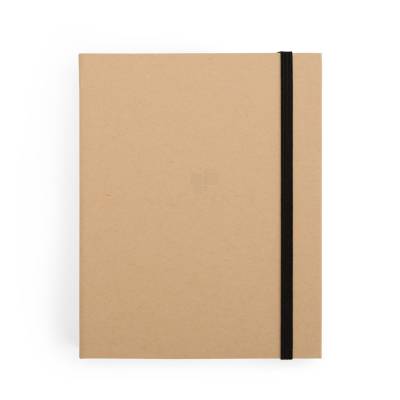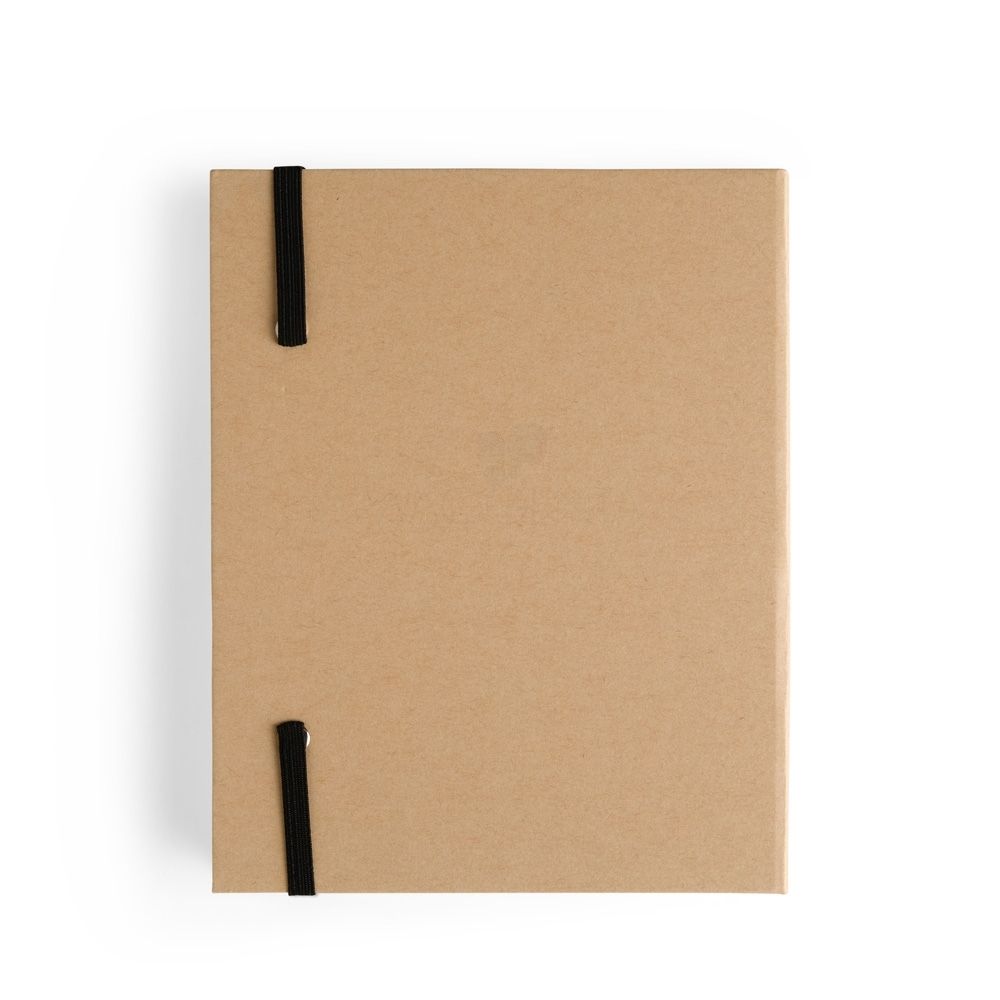 Bloco para Anotações Bloco de anotações com capa dura em kraft e fechamento por elástico. Possui aproximadamente 80 folhas de tonalidade marfim sem pautas e cinco canetas coloridas de ponta dupla: uma fina e outra tipo pincel. 14,3 cm x 18,1 cm x 2,3 cm 247 g