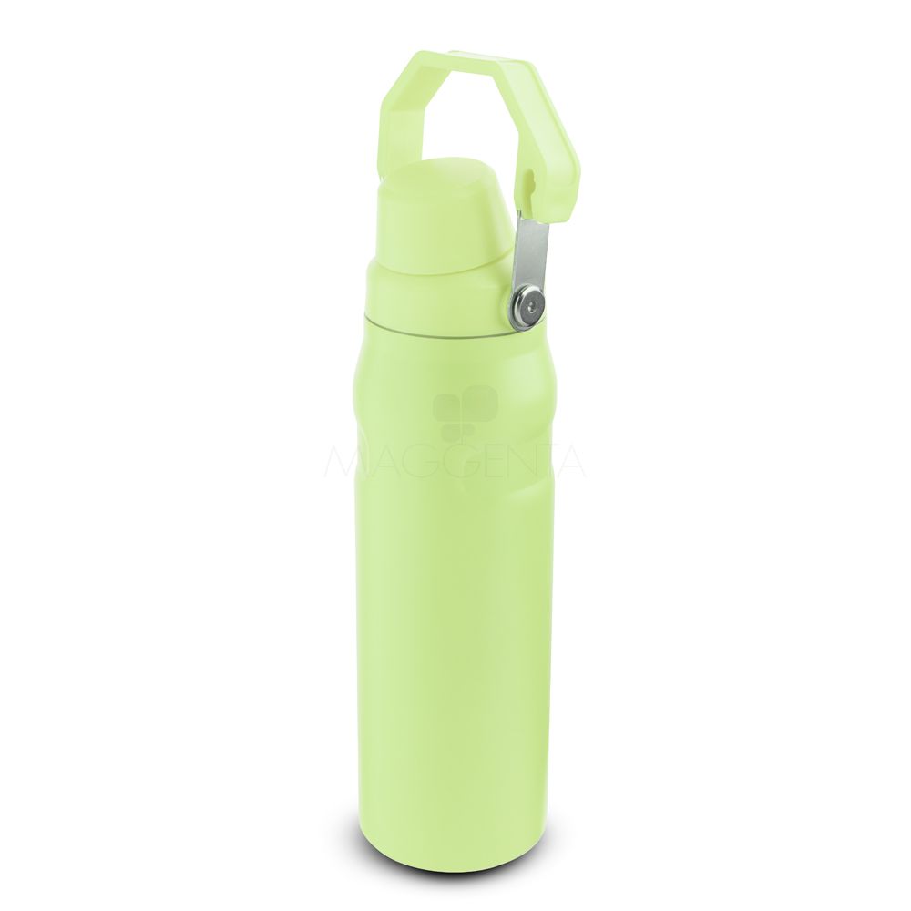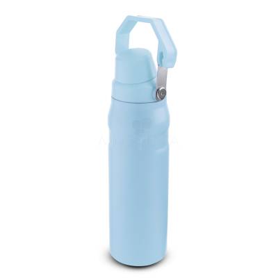 Garrafa térmica de 750 ml com parede dupla em inox (interno 304 / externo 201), pintura a pó e tampa em plástico PP. A tampa é removível e pode ser encaixada na alça.