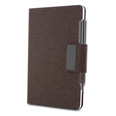 Caderno de anotações com capa em PU e fibra de chá ou café, 80 folhas 70 g/m², engate para caneta com fechamento magnético e placa de metal, não acompanha caneta.