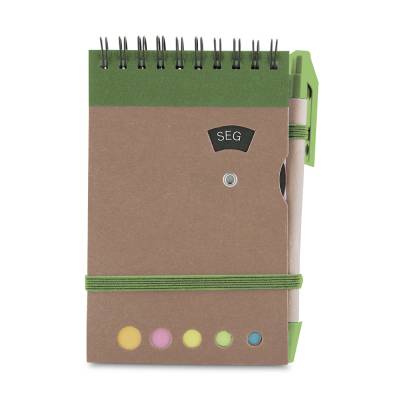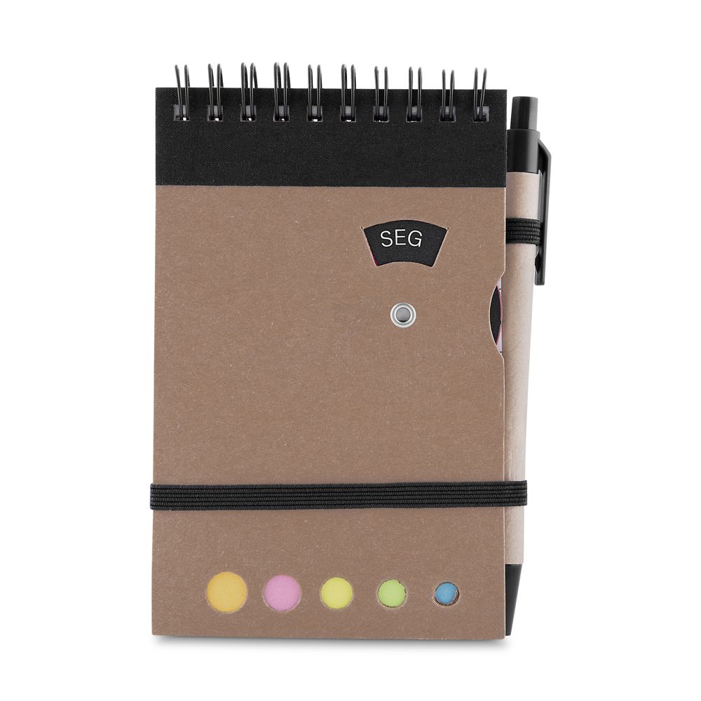 Caderno Mini Caderno com capa em papel kraft, com 70 folhas pautadas e blocos adesivos (sticky notes) coloridos. Acompanha disco rotativo na capa com os dias da semana e caneta produzida em papelão reciclado com detalhes em plástico e escrita em azul. 9,0 cm x 14,5 cm 92 g