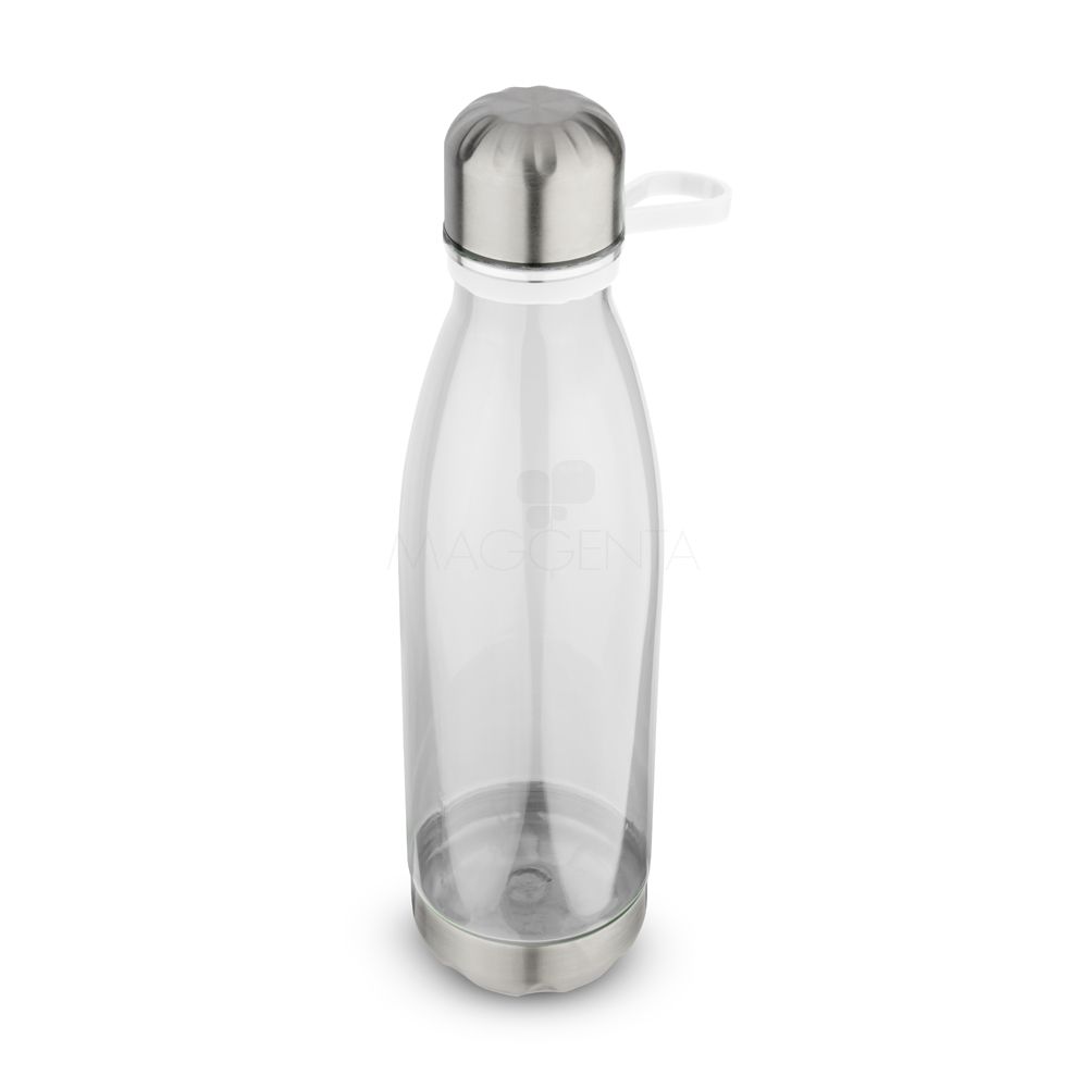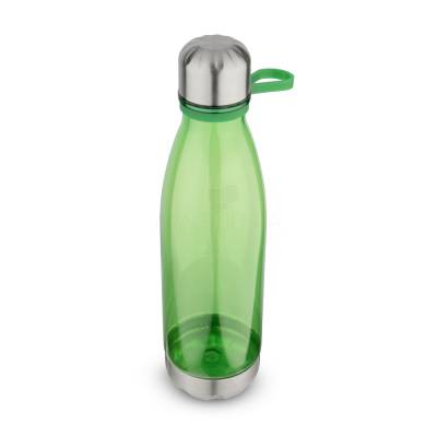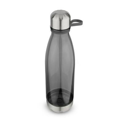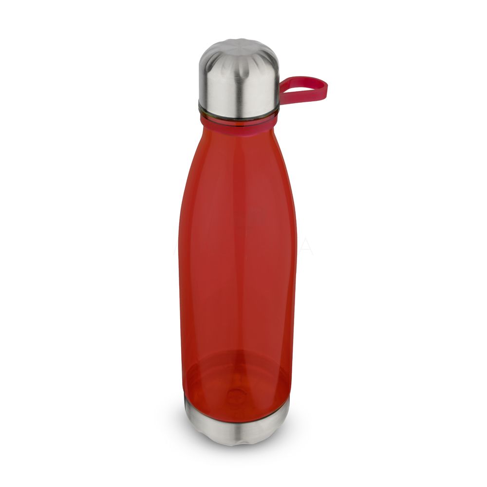 Garrafa plástica em RPET com capacidade de até 700 ml com alça flexível em silicone. Tampa rosqueável com anel de silicone para vedação, base em metal.