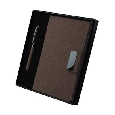 Kit Escritório Kit de Escritório composto por caderno tamanho A5, com capa em PU e detalhe em fibra de chá ou café, contendo 80 folhas pautadas de 70g/m². Acompanha caneta metálica com acabamento no mesmo material de fibra, formando um conjunto elegante e sofisticado. O kit acompanha estojo de papelão na cor preta. 13,2 cm x 20,7 cm 256 g