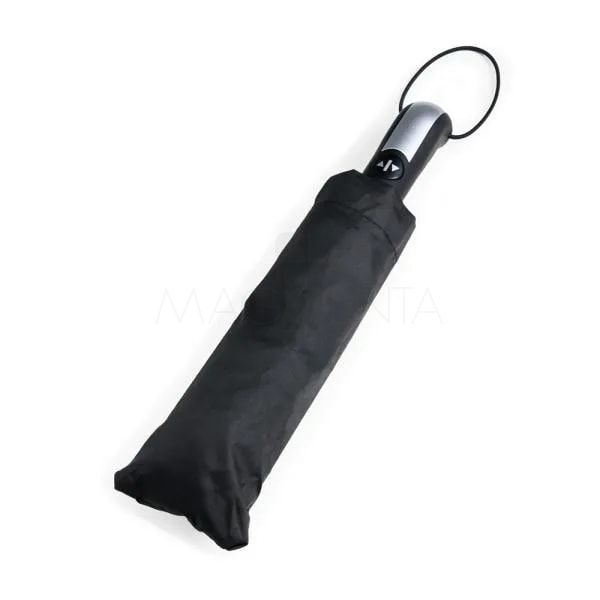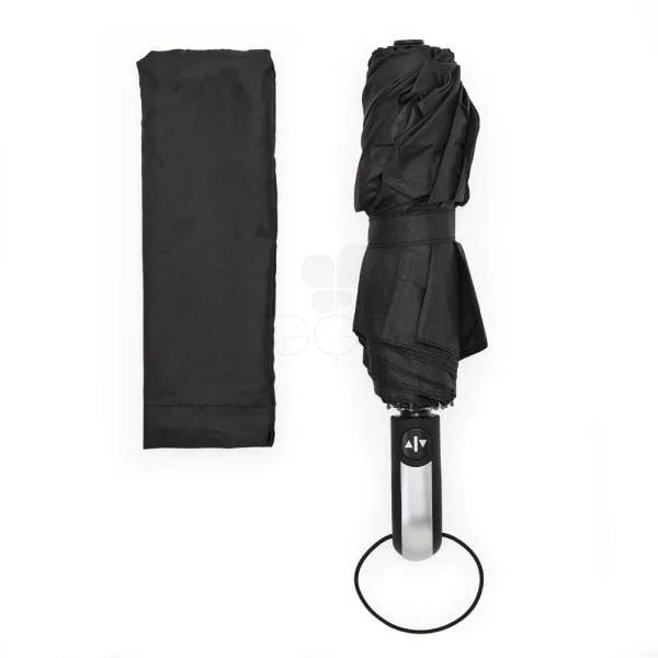 Guarda-chuva confeccionado em Nylon 190T na cor preta. Conta com ativação automática ao pressionar um botão, tanto para abrir quanto para fechar; empunhadura confortável com elástico para fixar no pulso, diminuindo o risco de queda e aumentando a segurança, com fechamento em velcro; capa em Nylon para melhor proteção e durabilidade.