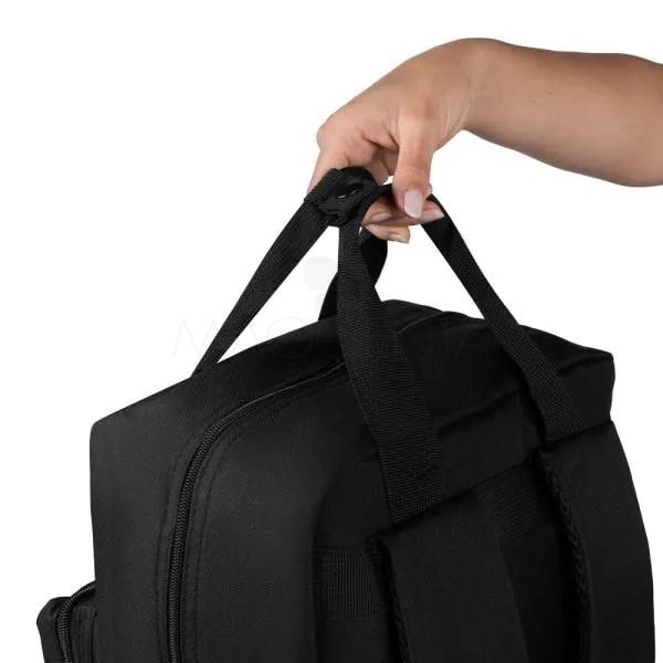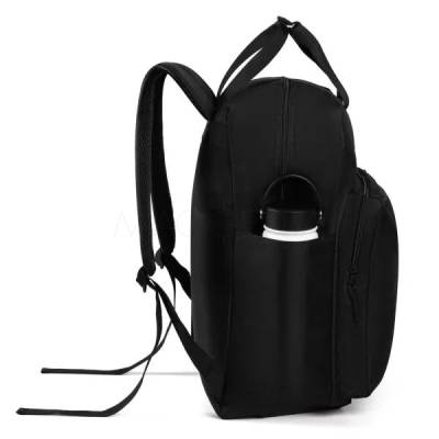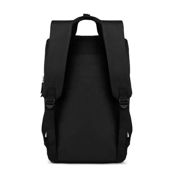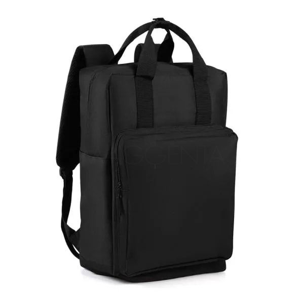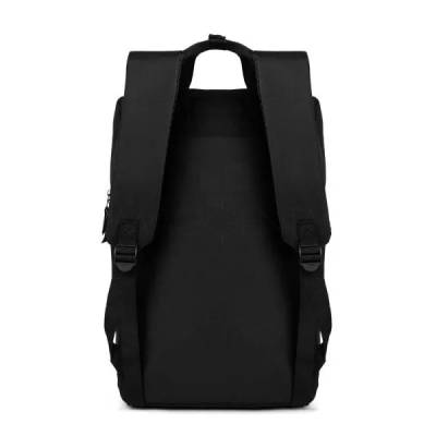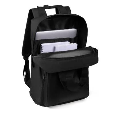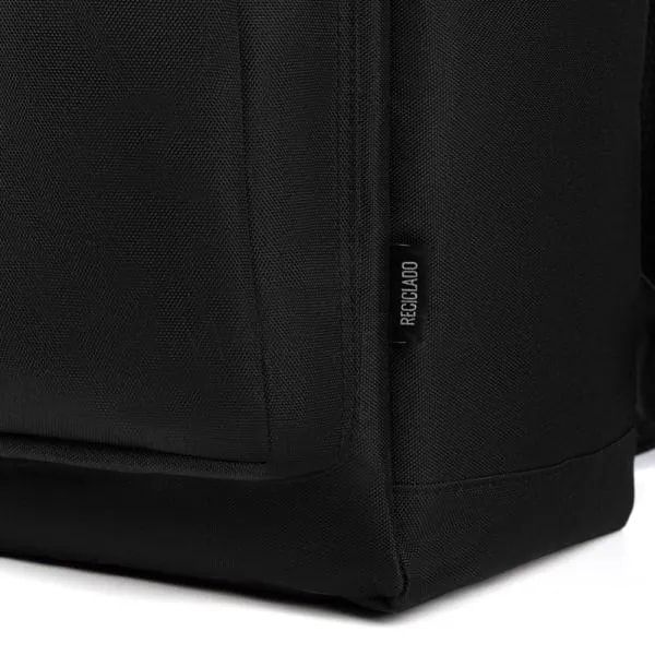 Mochila reciclada na cor preto em RPET. Conta com alcas para as costas, alca para as maos com fecho abotoavel. Na parte externa conta com dois bolsos laterais, um na parte frontal com ziper simples e o principal na parte superior, com fechamento em ziper duplo cursor. Na parte interna, conta com compartimento para notebook de ate 15" e mais seis compartimentos.