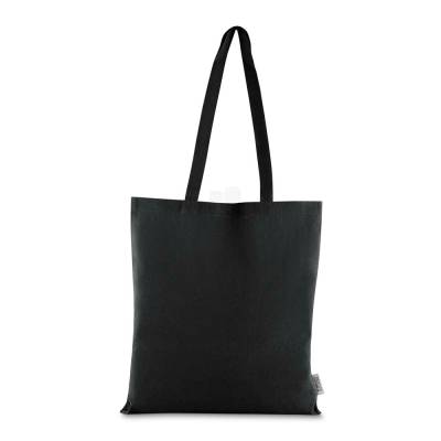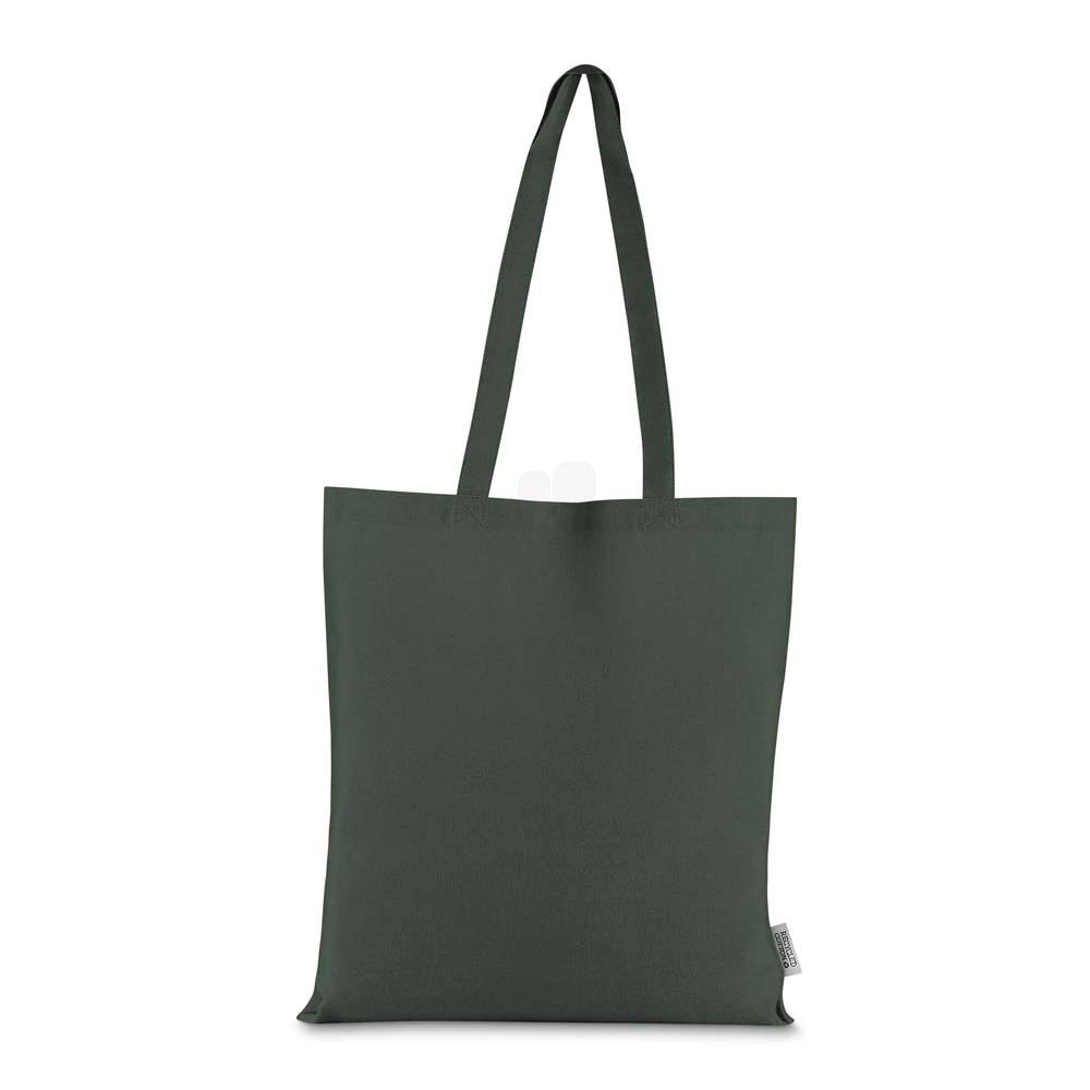 Bolsa confeccionada em algodao solido reciclado, com gramatura de 140g/m², dimensoes de 42 x 38 cm e alca de comprimento fixo medindo 33 cm.