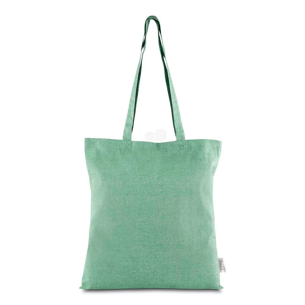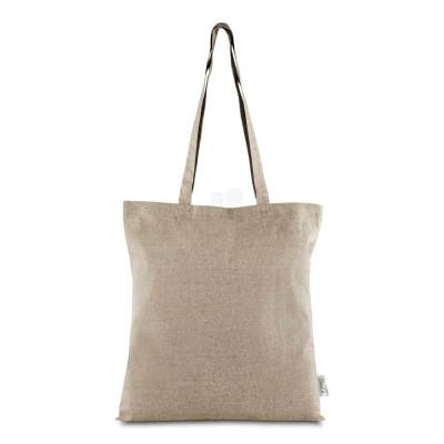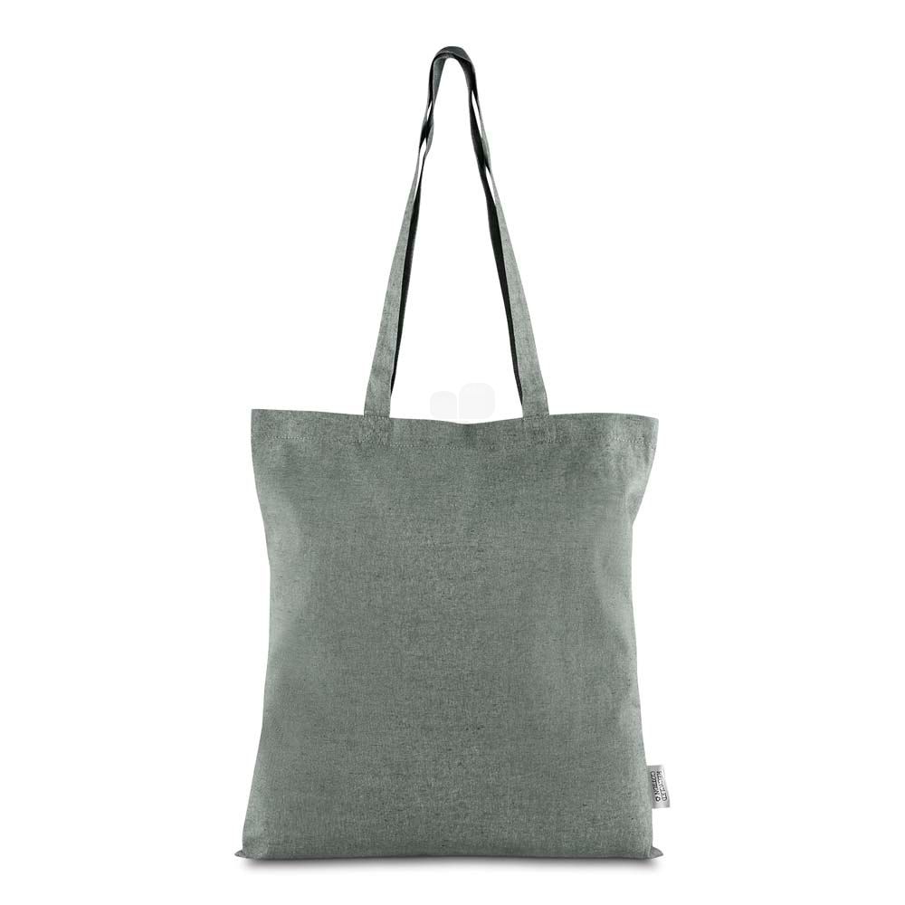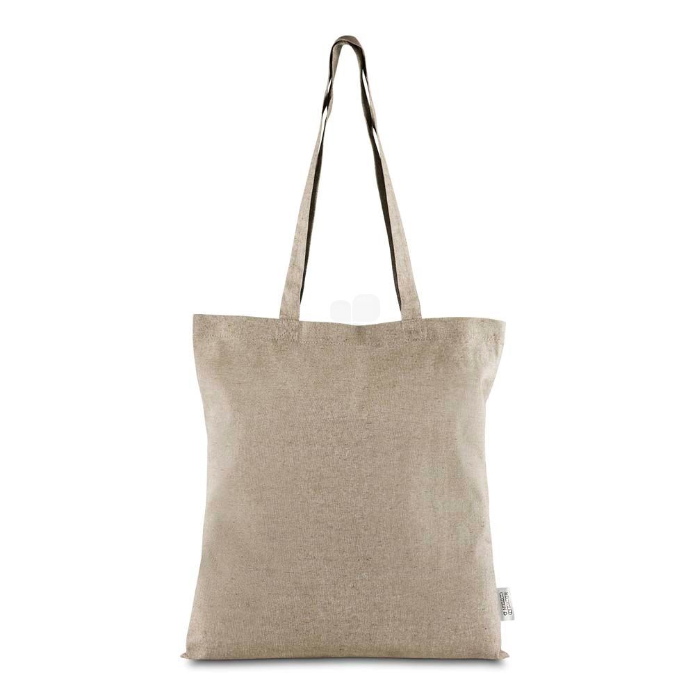 Sacola confeccionada em algodao mescla reciclado, gramatura 140 g/m². Possui alca de 65 cm ponta a ponta.